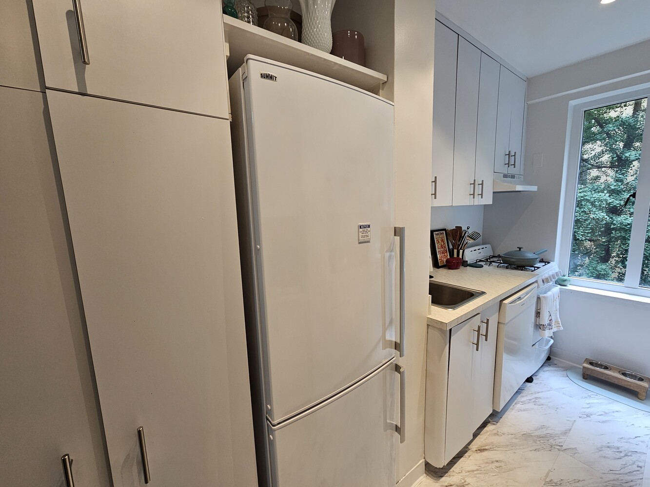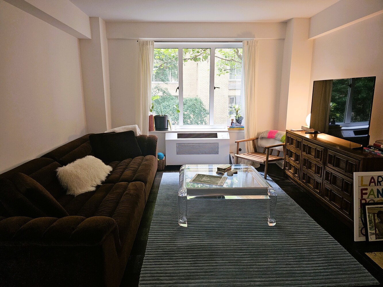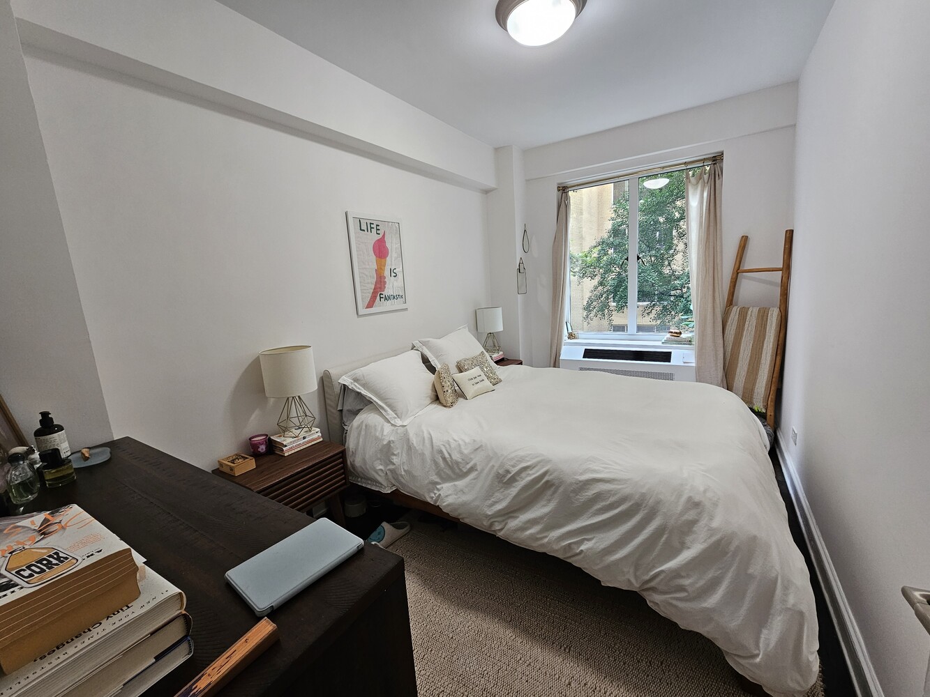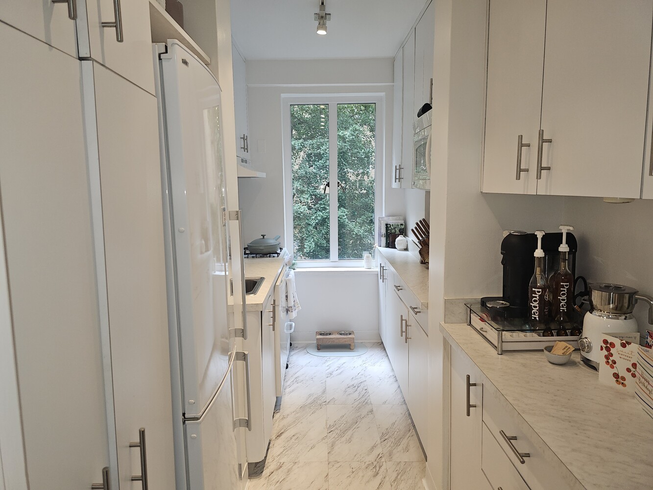 Open your door into a beautiful entry foyer with a large personal storage closet and separate coat closet. The Living and Dining Area are large, with a direct view out the window of our lovely landscaped courtyard. The windowed kitchen has plenty of counter space. The bedroom also faces the courtyard and has lovely prewar ceiling height and touches. It comfortably fits a queen-sized bed and feels comfortable and cozy.