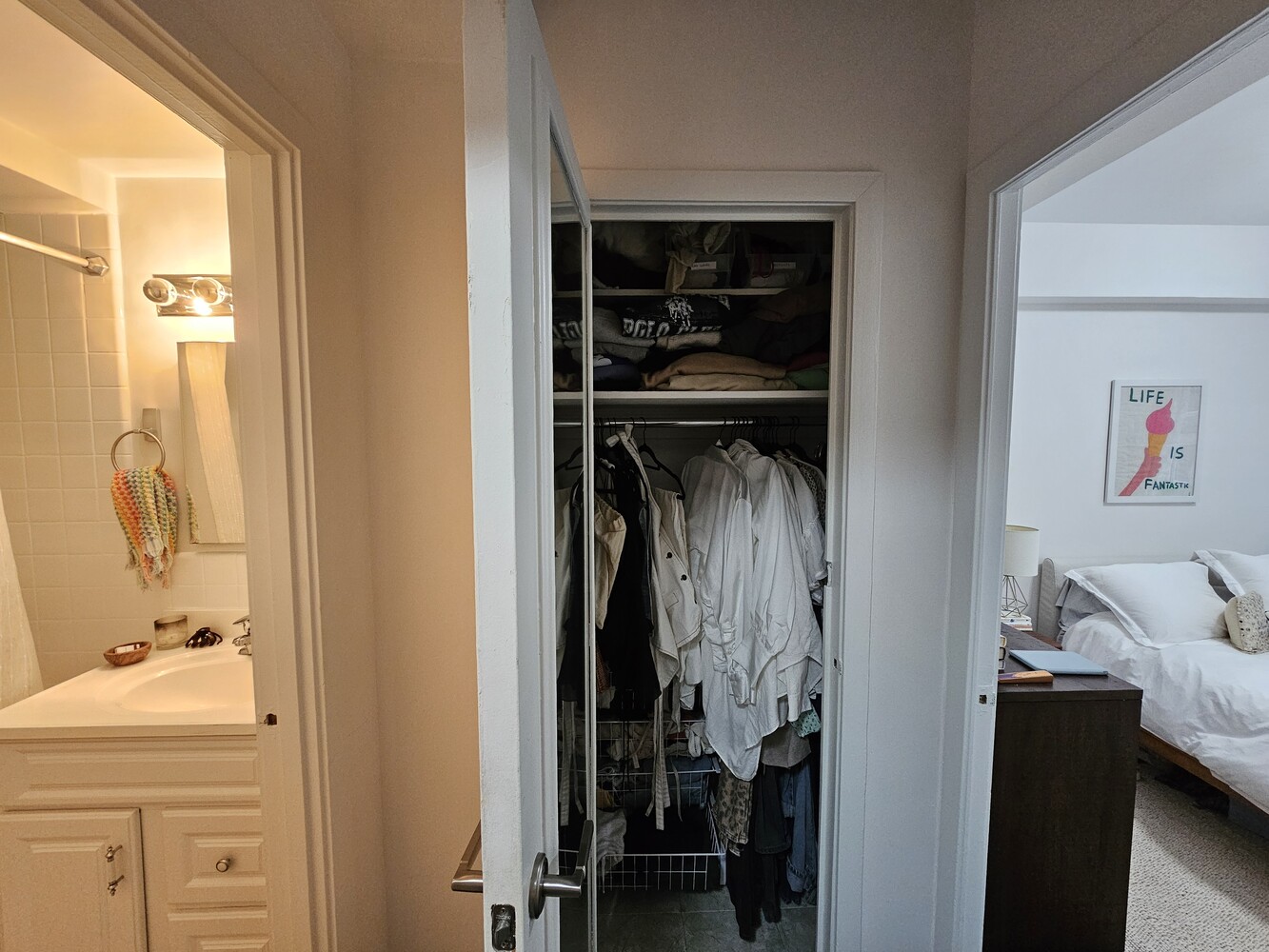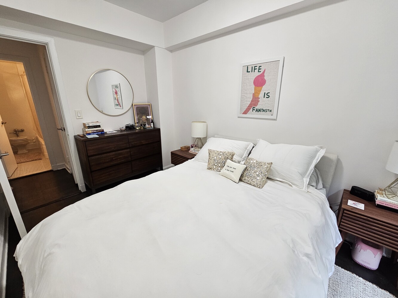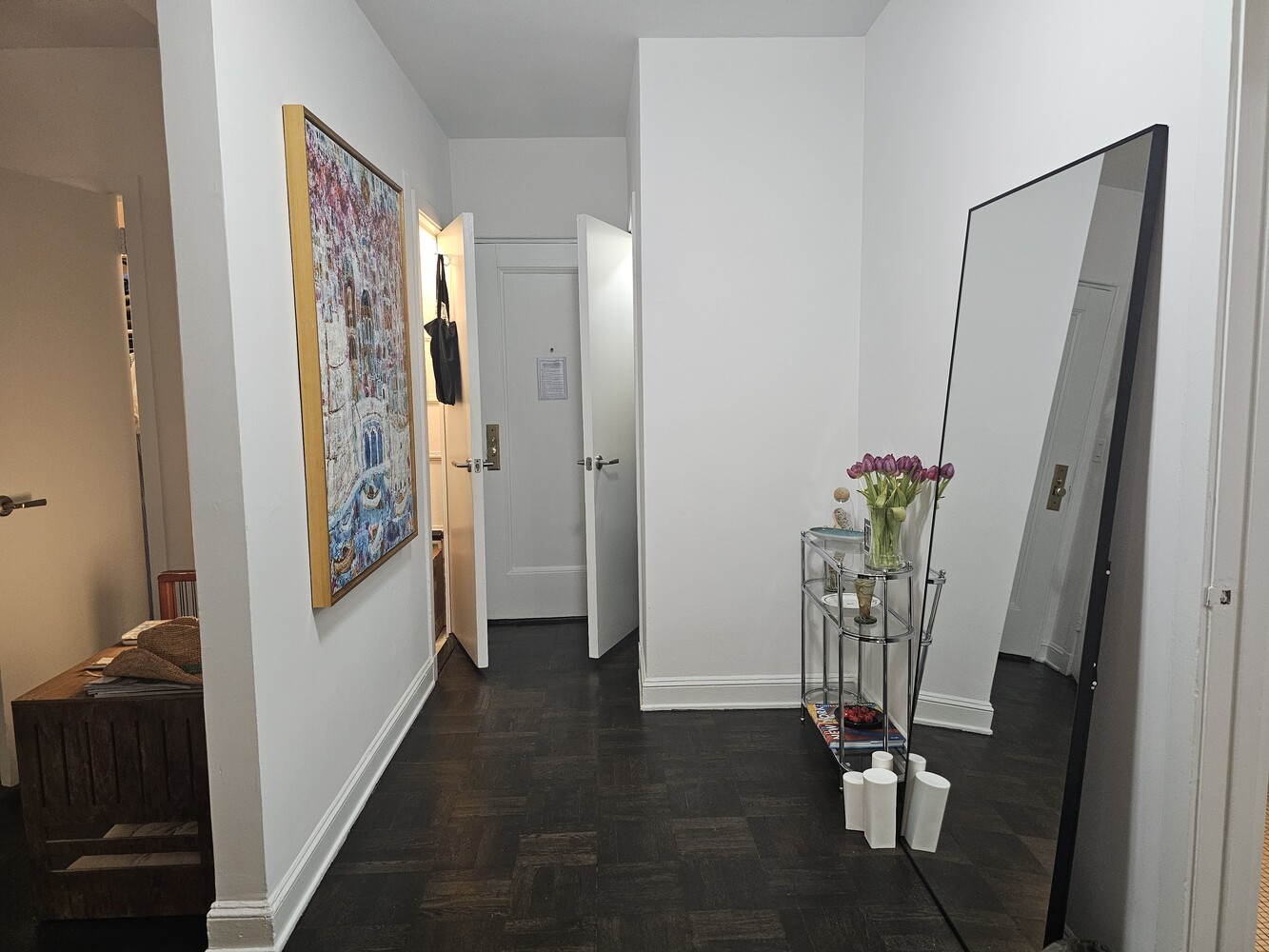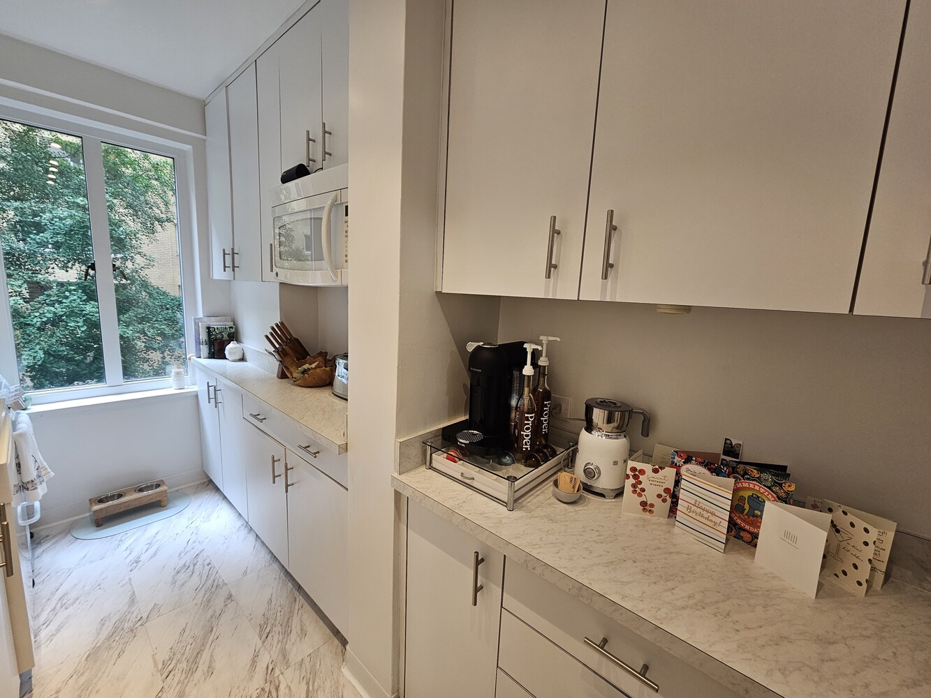 Open your door into a beautiful entry foyer with a large personal storage closet and separate coat closet. The Living and Dining Area are large, with a direct view out the window of our lovely landscaped courtyard. The windowed kitchen has plenty of counter space. The bedroom also faces the courtyard and has lovely prewar ceiling height and touches. It comfortably fits a queen-sized bed and feels comfortable and cozy.